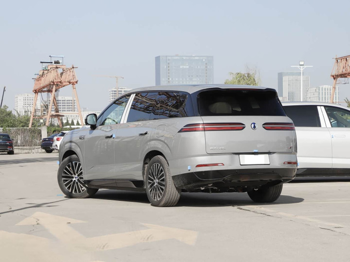 再来看车身侧面部分,车身侧面以流畅的腰线贯穿首尾,搭配隐藏式门把手和悬浮式车顶设计,风阻系数较低,兼顾美学与能效。 尺寸方面,5200mm车长与3075mm轴距构成“移动客厅”的基础,但设计师通过后轮主动转向技术(最小转弯半径4.58米)化解了大型SUV的笨重感,窄巷掉头甚至比紧凑型轿车更灵活。 轮毂提供20英寸多辐星芒与21英寸六叶草两种选择,后者搭配265mm宽胎,强化运动气质。 双色车身(霜云墨/翠华墨需选装)进一步提升了视觉层次,让这台“庞然大物”在街头同样吸睛。